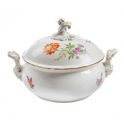 Terrine, rund mit Schnörkel, Blume 3 mitte, bunt, Goldrand, V 2,25 l