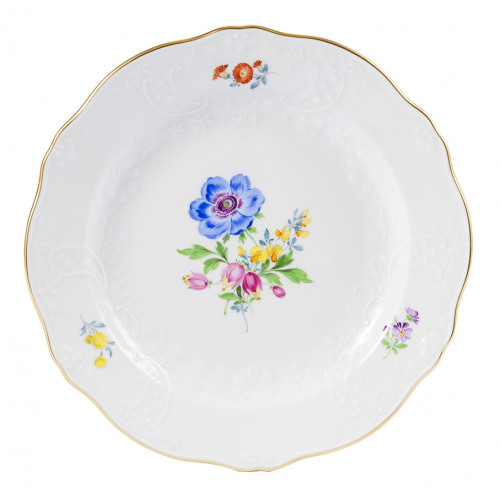 Teller, Form "Neumarseille", Blume 3 mitte, bunt, Goldrand, 18 cm
