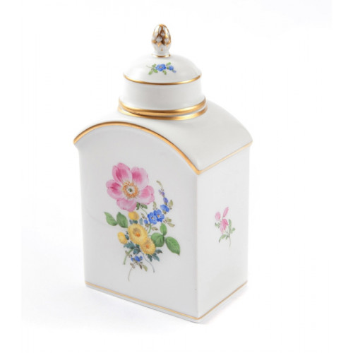 Teedose, Blume 3 mitte, bunt, Goldrand, H 14 cm
