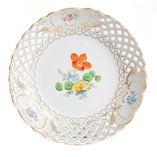 Schale, durchbr. rund, Blume 3 mitte, bunt, Goldrand und Goldstaffage, ø 25 cm