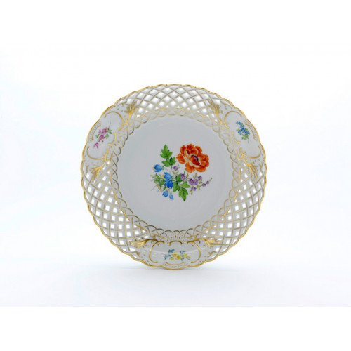 Schale,durchbr. rund, Blume 3 mitte, bunt, Goldrand und Goldstaffage, ø 27 cm