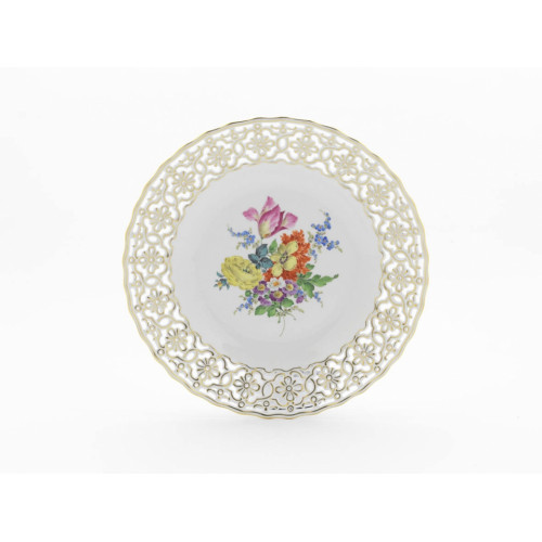 Teller, durchbr., Bukett mitte, bunt, Goldrand und Goldstaffage, ø 29 cm