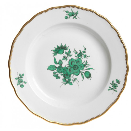 Speiseteller, Form "Neuer Ausschnitt", Bukett mitte, kupfergrün, Goldzahnkante, Goldrand, L 25 cm