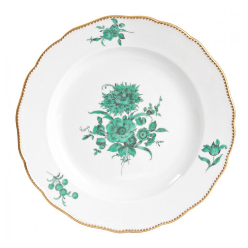 Teller m.H., Form "Neuer Ausschnitt", Bukett mitte, kupfergrün, Goldzahnkante, Goldrand, ø 25 cm