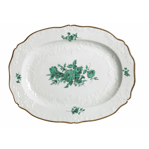 Platte,oval, Bukett mitte, kupfergrün, Goldzahnkante, Goldrand, 44x32 cm