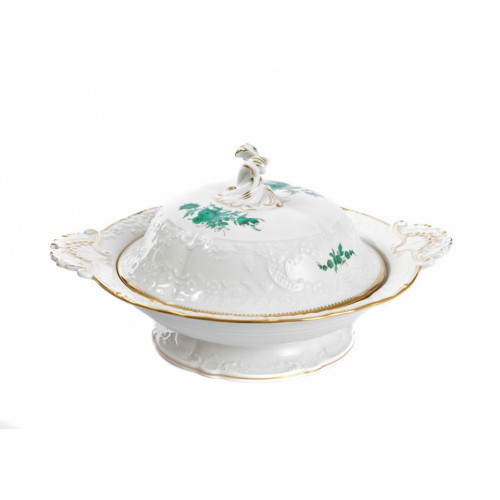 Schüssel m.Deck., Form "Neumarseille", Bukett mitte, kupfergrün, Goldzahnkante, Goldrand, 0,8 l