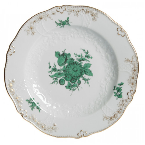 Speiseteller, Form "Neumarseille", Bukett mitte,kupfergrün,Goldzackenkte.Goldschleif.Goldblumenr.Goldrand, 25 cm