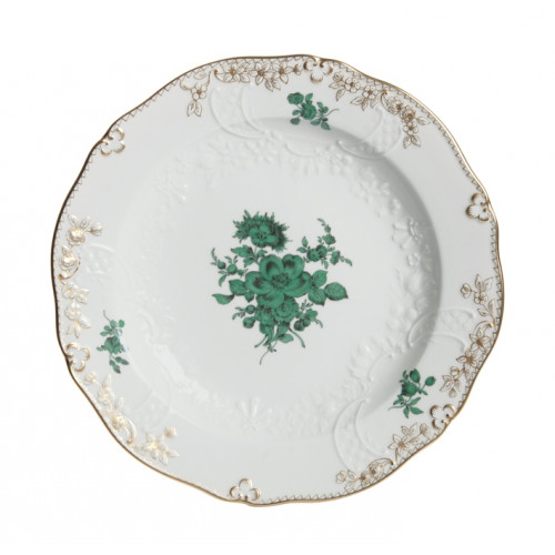 Teller, Form "Neumarseille", Bukett mitte,kupfergrün,Goldzackenkte.Goldschleif.Goldblumenr.Goldrand, 18 cm