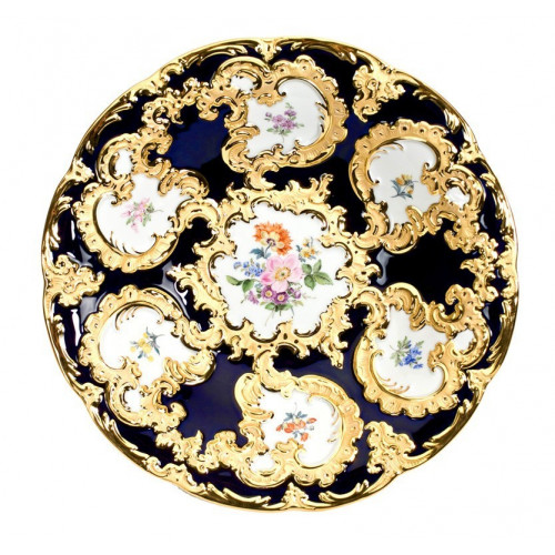Schale, Bukett mitte, bunt, königsblau glasiert, Goldbronze, 28 cm