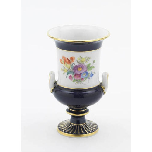Vase, Bukett mitte, bunt, königsblau Hals und Fuß glasiert, Goldrand, H 14 cm