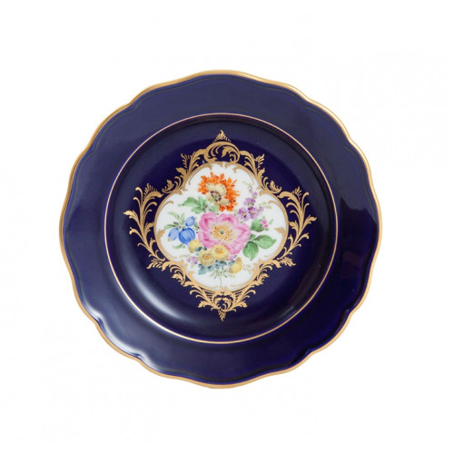 Teller, Bukett mitte,bunt,königsbl.glas.1 Schild,Goldgroteskes Schild,Goldrand, ø 14 cm