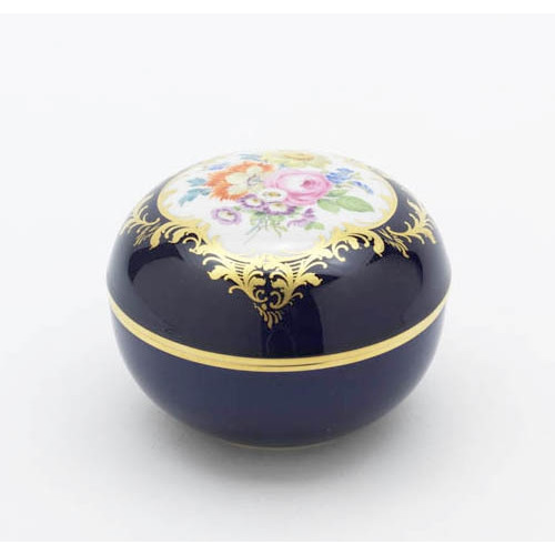 Dose, Bukett mitte,bunt,königsbl.glas.1 Schild,Goldgroteskes Schild,Goldrand, ø 9 cm