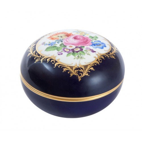 Dose, Bukett mitte,bunt,königsbl.glas.1 Schild,Goldgroteskes Schild,Goldrand, ø 13 cm
