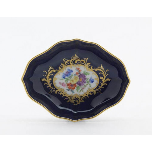 Schälchen, Bukett mitte,bunt,königsbl.glas.1 Schild,Goldgroteskes Schild,Goldrand, L 10 cm