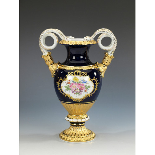 Vase, Bukett mitte,bunt,königsblau glasiert,Goldgroteskes Schild,Goldbronze, H 29,5 cm