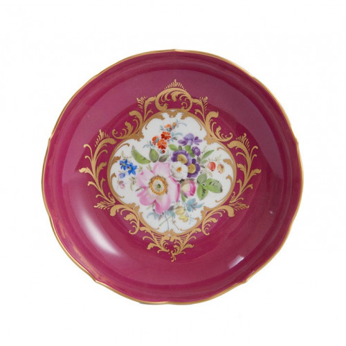 Schälchen, Bukett mitte, bunt, purpur glasiert, Goldgroteskes Schild, Goldrand, ø 13,5 cm