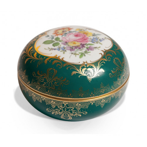 Dose, Bukett mitte,bt.,russ.-gr.glas.,Goldgrot.Schild,-spitzenk.-arab.-rand, ø 13 cm