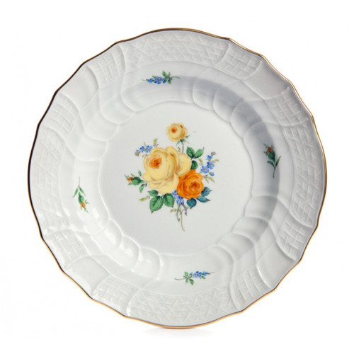 Teller, Rosenbukett mit Vergißmeinnicht, gelb, Goldrand, 18,5 cm
