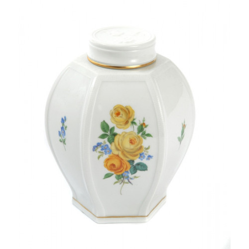 Dose, Rosenbukett mit Vergißmeinnicht, gelb, Goldrand, 14,5 cm