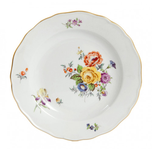 Teller, Form "Neuer Ausschnitt", Bukett, alte Manier, bunt mit Kupferfarben, Goldrand, ø 20 cm