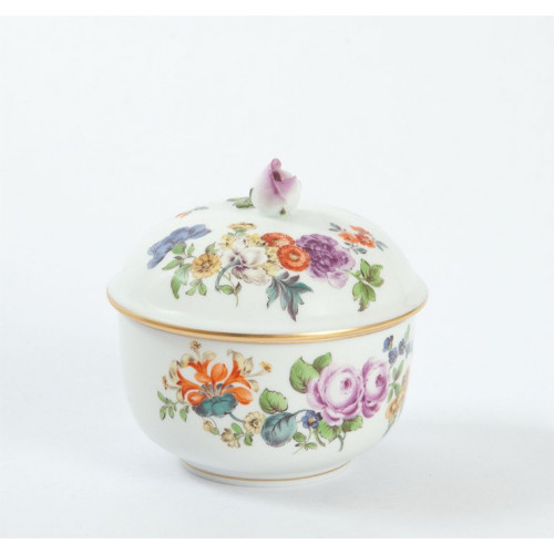 Zuckerdose, Bukett, alte Manier, bunt mit Kupferfarben, Goldrand, Ø 9 cm