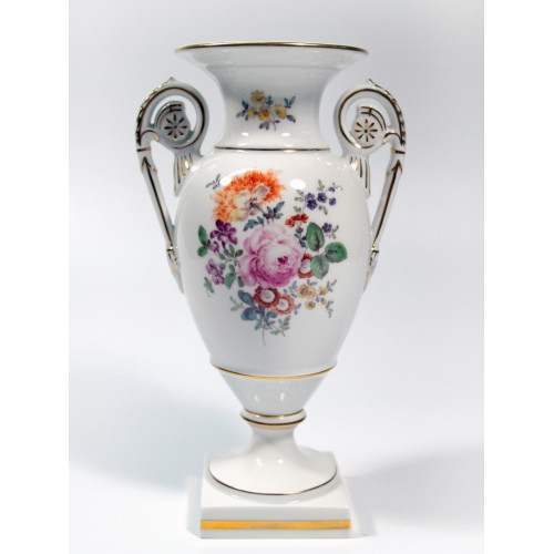 Vase, Bukett, alte Manier, bunt mit Kupferfarben, Goldrand, H 22 cm