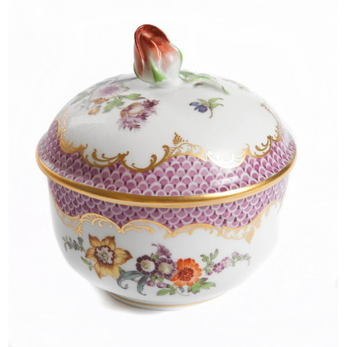 Zuckerdose, Form "Neuer Ausschnitt", Bukett, alte Manier, bunt m. Kupferf., Schuppenmosaik, purpur, Golddek, Ø 9 cm
