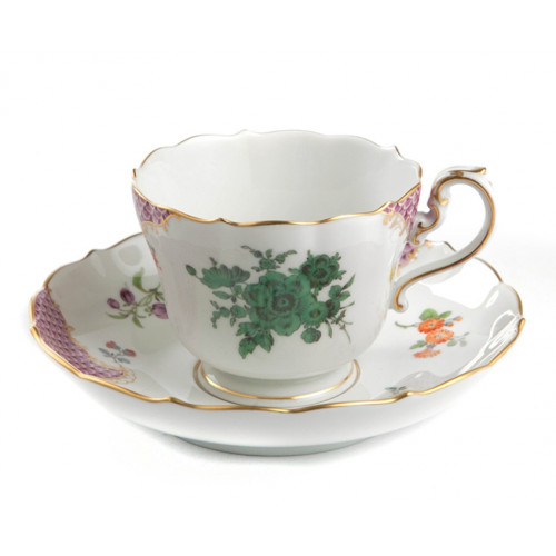Tasse m.U., Form "Neuer Ausschnitt", Blumenmalerei, kupfergrün und bunt, Schuppenmosaik purpur, Golddek., V 0,15 l
