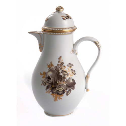 Mokkakanne, Form "Glatte Form", Bukett,sepia,goldgrav.Blätter,Marcol.-Malw.,Goldgaleriekante,Goldrand, 0,4 l