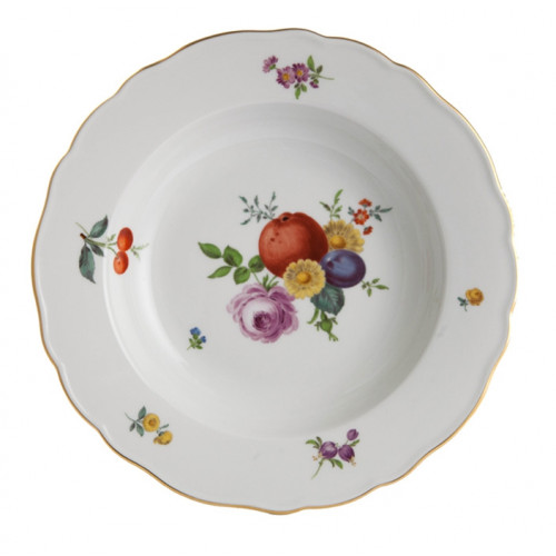 Suppenteller, Form "Neuer Ausschnitt", Frucht- u. Blumenmalerei, alte Manier, bunt, Goldrand, ø 22 cm
