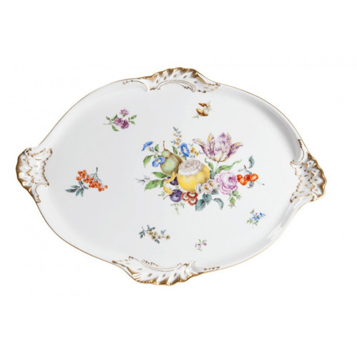 Platte, oval, Frucht- u. Blumenmalerei, alte Manier, bunt, Goldrand, 46x33 cm