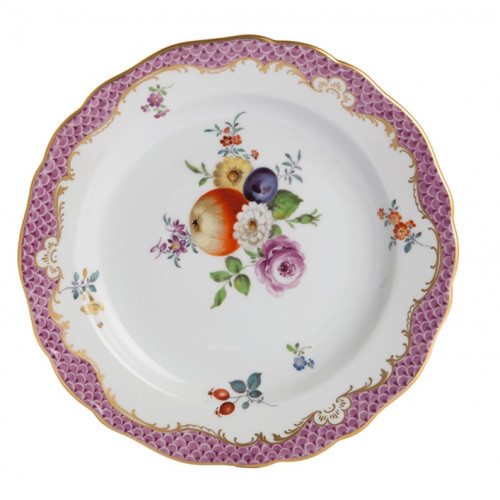 Teller, Form "Neuer Ausschnitt", Frucht- u.Blumenmal.bunt,Schuppenmosaik,purpur,Goldabschluß,Goldrand, ø 18 cm