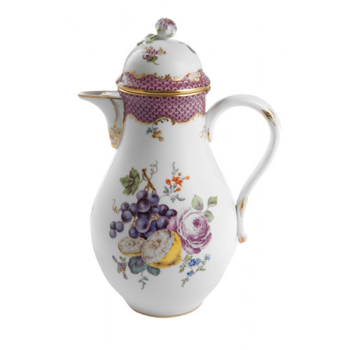 Mokkakanne, Form "Glatte Form", Frucht- u.Blumenmal.bunt,Schuppenmosaik,purpur,Goldabschluß,Goldrand, 0,4 l