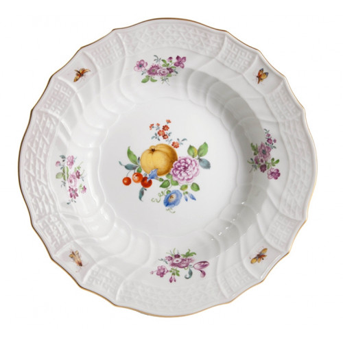 Suppenteller, Frucht-u.Blumenm.,alte Manier,m.Insekt.,bunt,Bukettch.purp.grün,Goldr., 24 cm