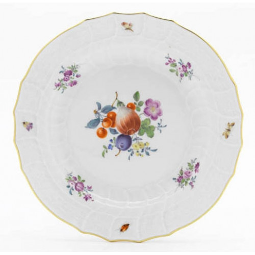 Teller, Frucht-u.Blumenm.,alte Manier,m.Insekt.,bunt,Bukettch.purp.grün,Goldr., 18 cm