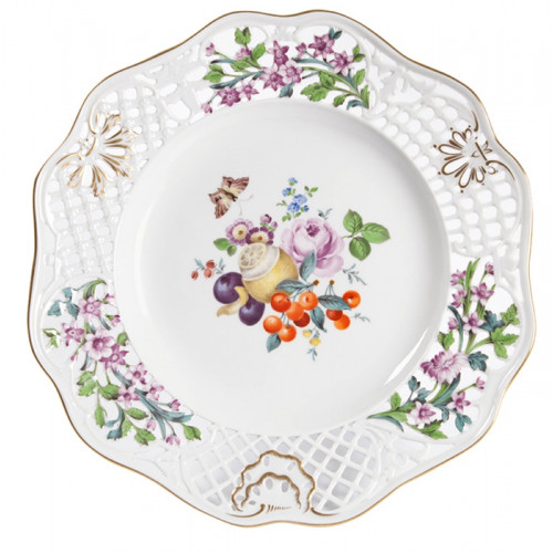 Teller m.H., Frucht-u.Blumenmal.,alte Manier,bunt,purpur u.grüne Bukettch.u.Insekt.,
