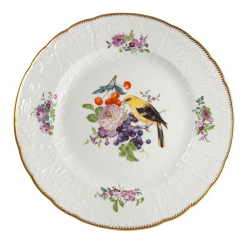 Speiseteller, Frucht-u.Blumenmal.m.Vogel, alte Manier, bunt, Kupferfarben, Golddek., 25 cm