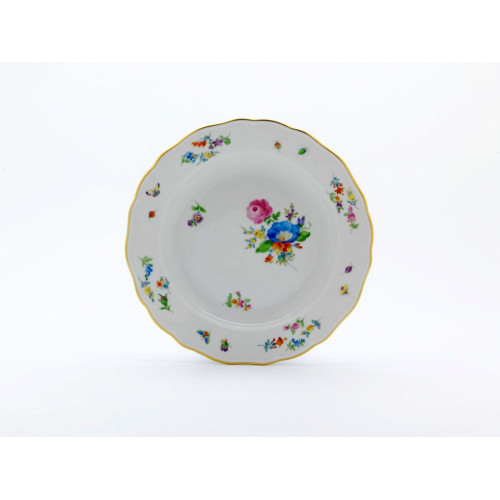 Teller, Form "Neuer Ausschnitt", Blumen und Insekten, bunt, Goldrand, ø 20 cm