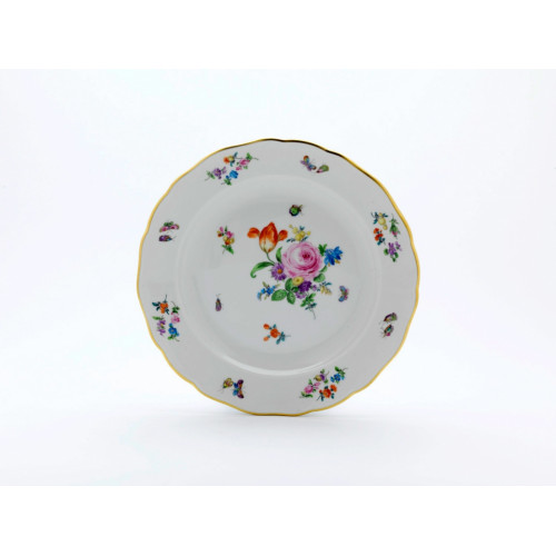 Speiseteller, Form "Neuer Ausschnitt", Blumen und Insekten, bunt, Goldrand, L 25 cm