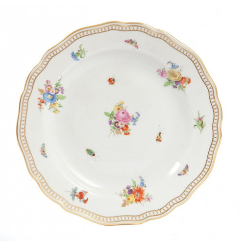 Teller, Gestreute Bukettchen m. Insekten, bunt, goldgrav. Blätter, Golddek., ø 18 cm