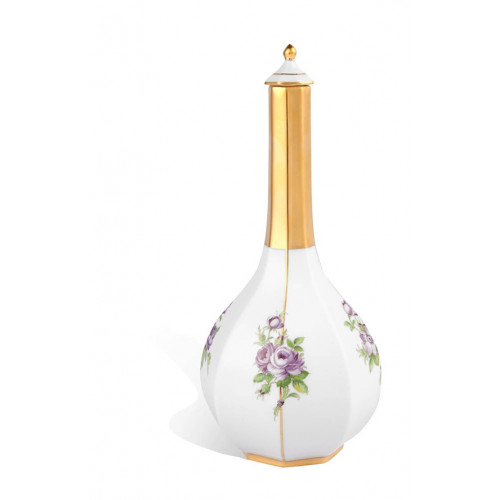 Spielerisch und zugleich streng symmetrisch betonen zarte Blüten den eleganten Schwung der Form des Flakons. Jedes in feinsten Pinselstrichen und allen Schattierungen gemalte Bukett zeigt immer nur eine Sorte Blumen: zweierlei Rosen, Ranunkeln und Winden. Die zurück¬haltende Zweifarbigkeit der Manierblumenmalerei verleiht den kunstvollen Stücken ihre innere Stimmigkeit, das Spiel der Gegensätze den Reiz und das hochkarätige Gold auf dem Hals des Flakons die Aura großer Kostbarkeit.