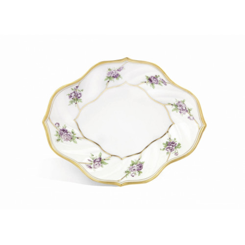Spielerisch und zugleich streng symmetrisch betonen zarte Blüten den eleganten Schwung der Form der Schale. Jedes in feinsten Pinselstrichen und allen Schattierungen gemalte Bukett zeigt immer nur eine Sorte Blumen: zwei verschiedenartige Rosen, Astern und Mohn. Die zurückhaltende Zweifarbigkeit der Manierblumenmalerei verleiht den kunstvollen Stücken ihre innere Stimmigkeit, das Spiel der Gegensätze den Reiz und das hochkarätige Gold auf dem Schalenrand die Aura großer Kostbarkeit.