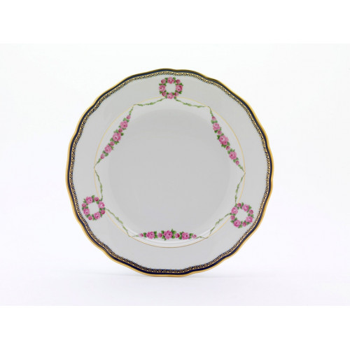 Speiseteller, Form "Neuer Ausschnitt", Rosenranken u.Kränzch.bunt,königsbl.Reifen glas.,Gold-A-Kante,Goldrand, L 25 cm