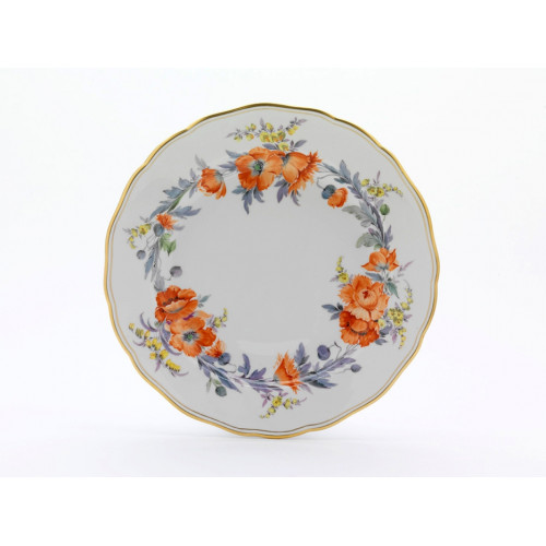 Speiseteller, Form "Neuer Ausschnitt", Mohnblumenkranz, bunt, Goldrand, Goldanschlußfaden, L 25 cm