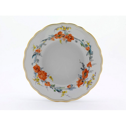 Suppenteller, Form "Neuer Ausschnitt", Mohnblumenkranz, bunt, Goldrand, Goldanschlußfaden, ø 24 cm