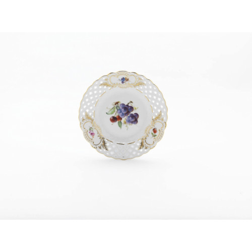 Teller, durchbr., Fruchtmalerei, bunt, Schilderornamente goldstaffiert, Goldrand, ø 19 cm