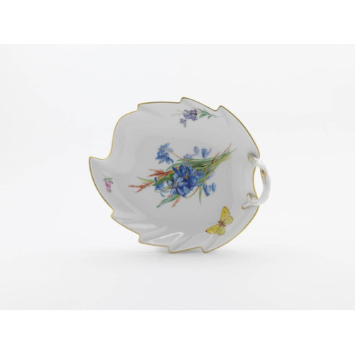 Konfektblatt, Form "Neuer Ausschnitt", Blume naturalistisch, bunt, mit Schmetterling, Goldrand, L 22 cm