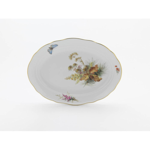 Platte, oval, Form "Neuer Ausschnitt", Blume naturalistisch, bunt, mit Schmetterling, Goldrand, L 28,5 cm