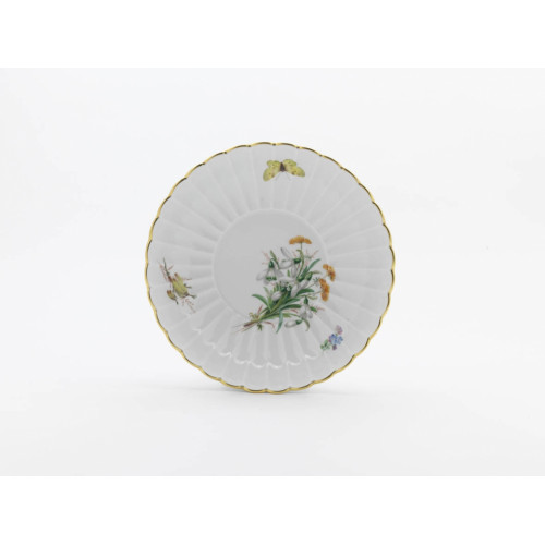 Beilageschale rund,gemuschelt, Form "Neuer Ausschnitt", Blume naturalistisch, bunt, mit Schmetterling, Goldrand, ø 20 cm