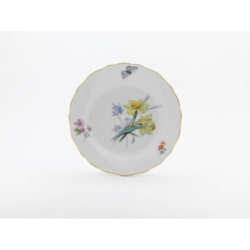 Teller, Form "Neuer Ausschnitt", Blume naturalistisch, bunt, mit Schmetterling, Goldrand, ø 20 cm
